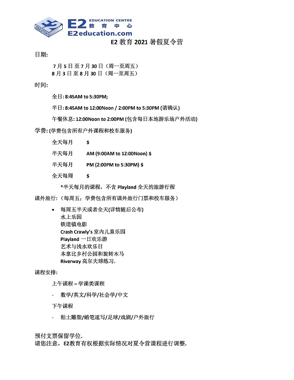 E2教育中心开始接受2021年暑期夏令营报名。2021年暑期夏令营为期2个月,时间是2021年7月5日到7月30日,8月3日到8月30日。每周上午学习内容以英文读写,数学,中文,社会科学为主, 下午是丰富的艺术或课外课程,例如:美术绘画,手工粘土制作,足球,基础戏剧表演,Playland一日游等有趣的活动节目。以下是我们夏令营详情跟课程安排,费用与其他详情请email联系我们。